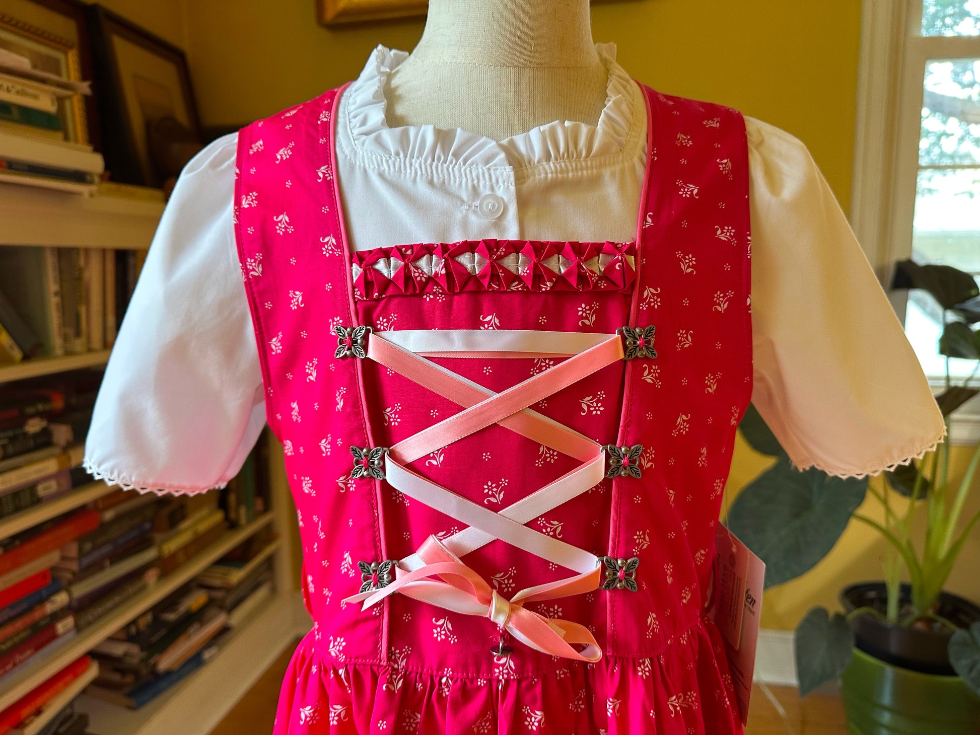 Breathable for summer and built to withstand some play. Complimentary shades of pink paired with traditional ribbon decoration (double on the bodice) and around dirndl's collar. White raised pleating trims the shirt collar with lace edging on the puffed sleeves. Part of Isar Trachten's 2024 "Das Krackende" collection.
