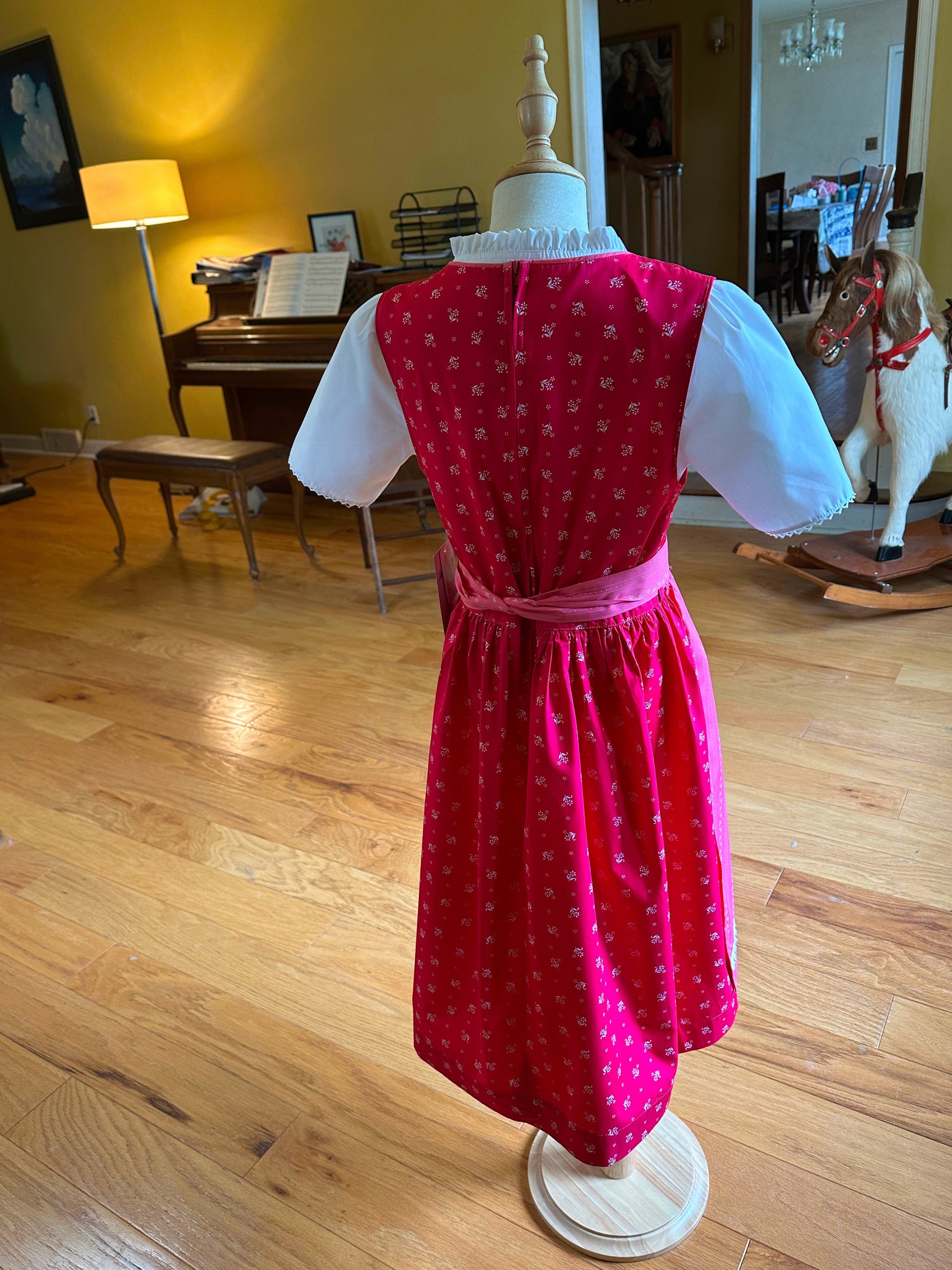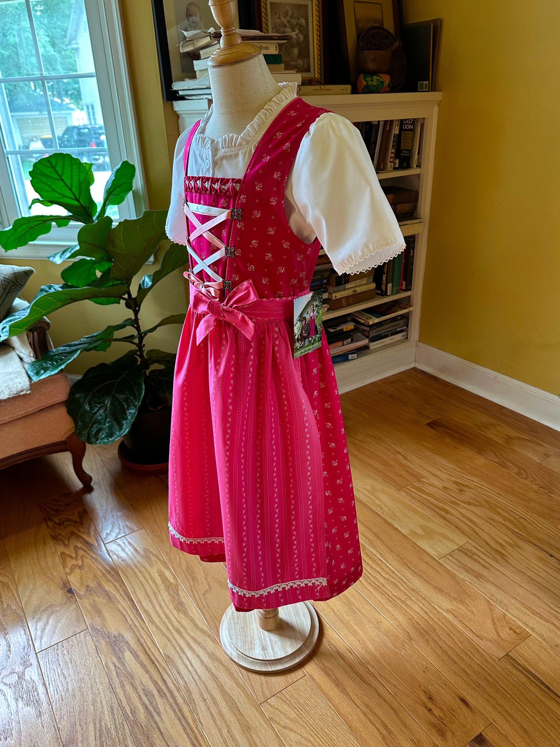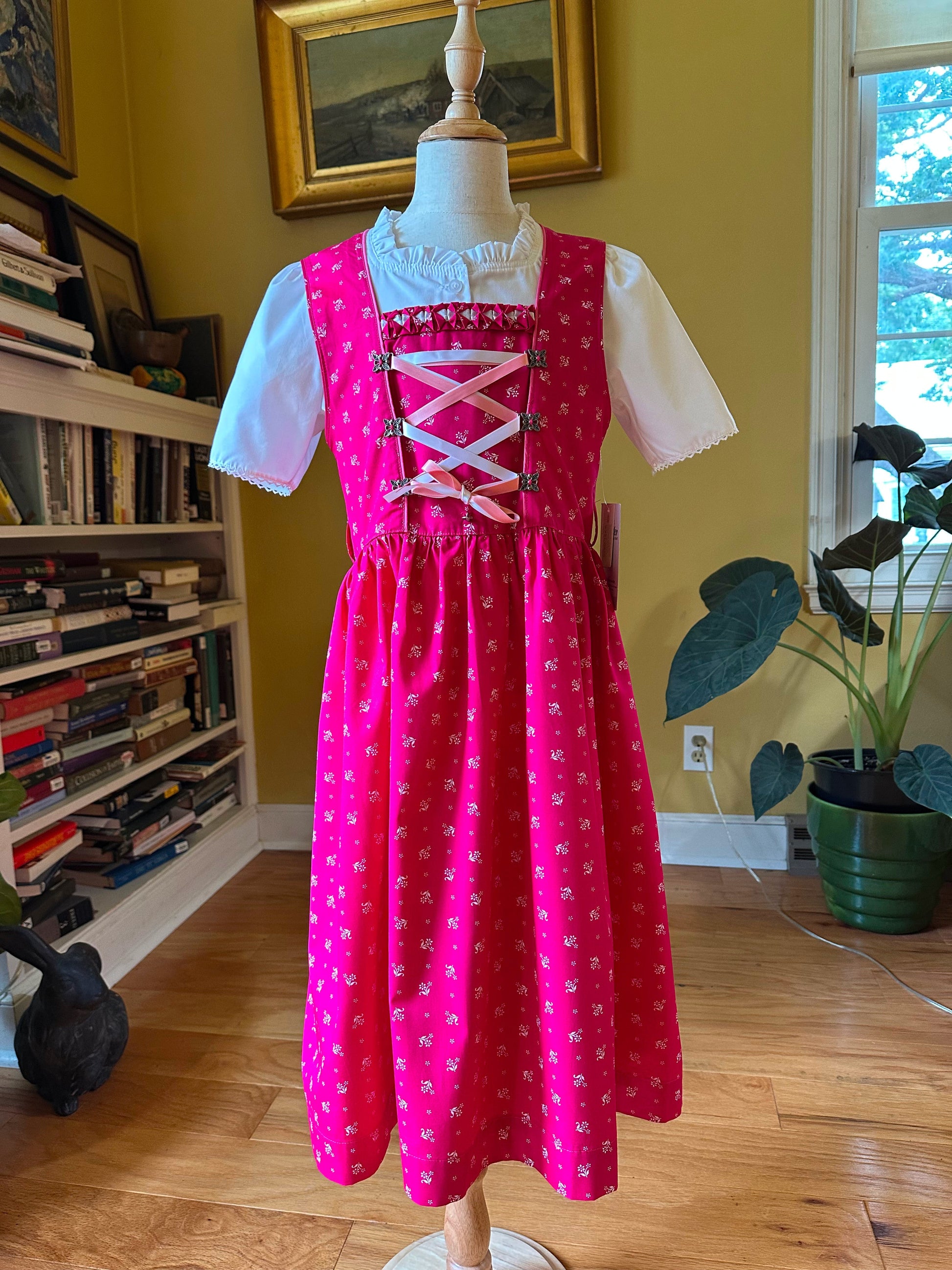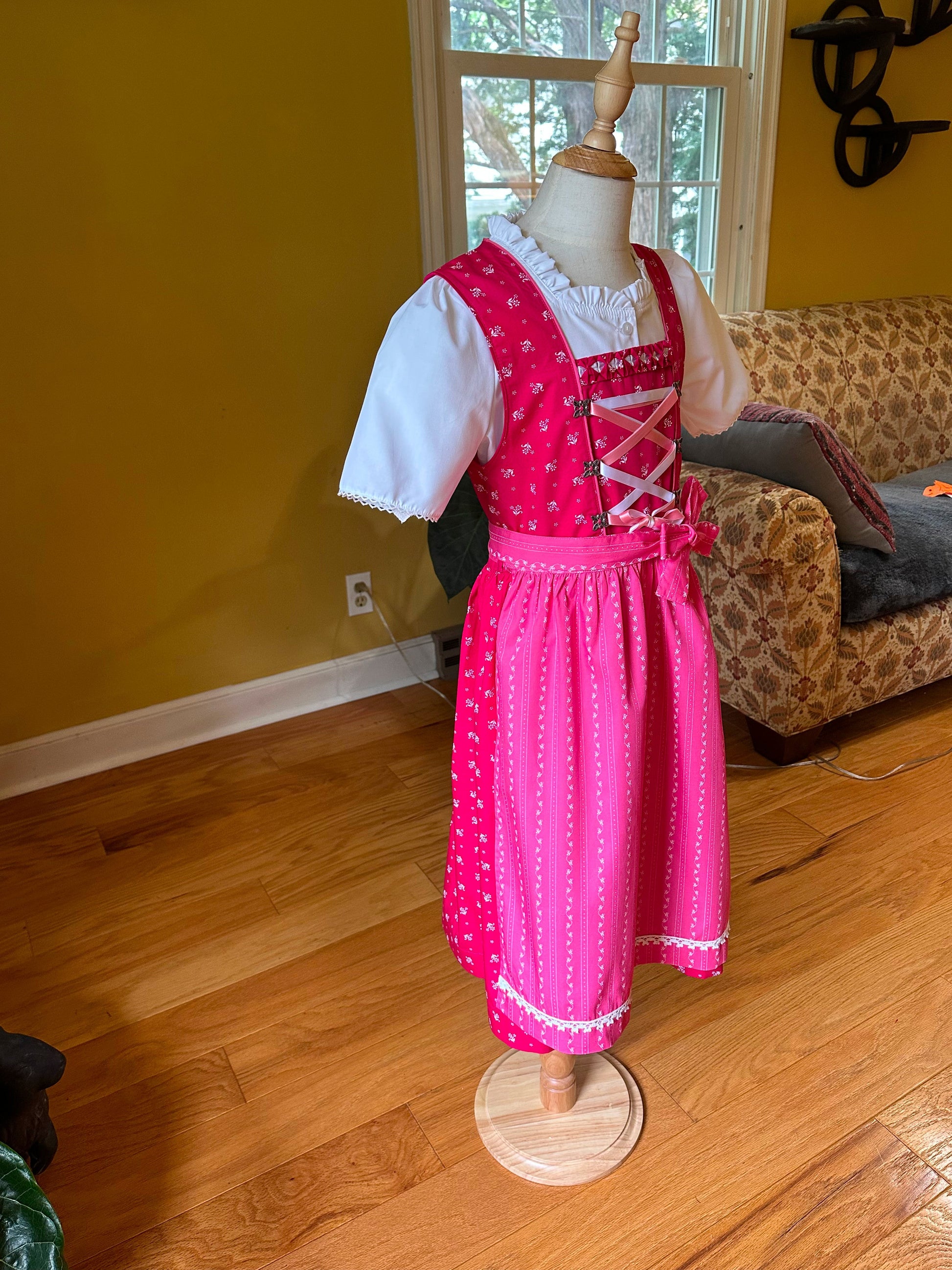 Made in Germany. This is a set: dirndl (hot pink), shirt (white) and apron (bubblegum pink) are included. 100% cotton.