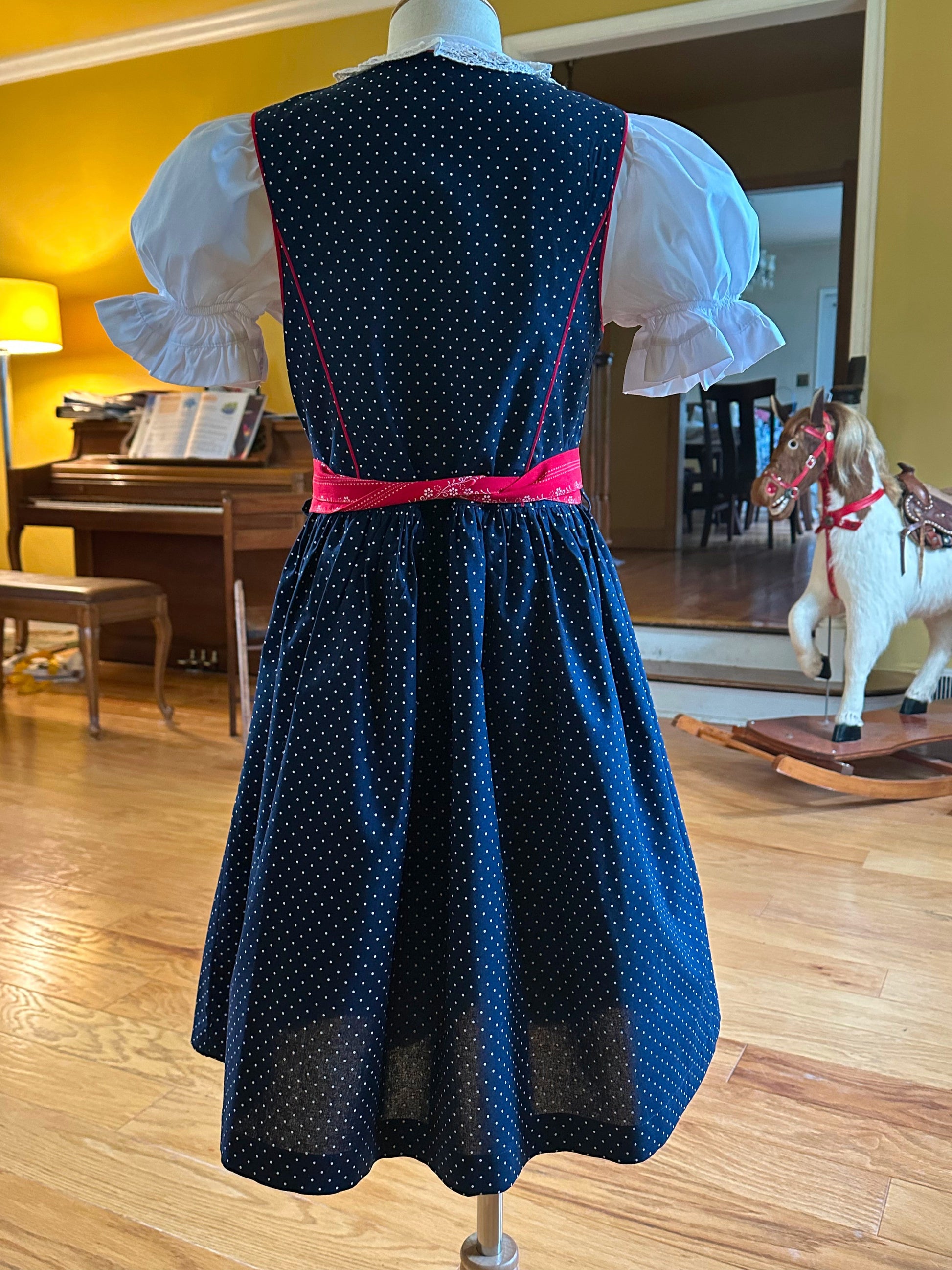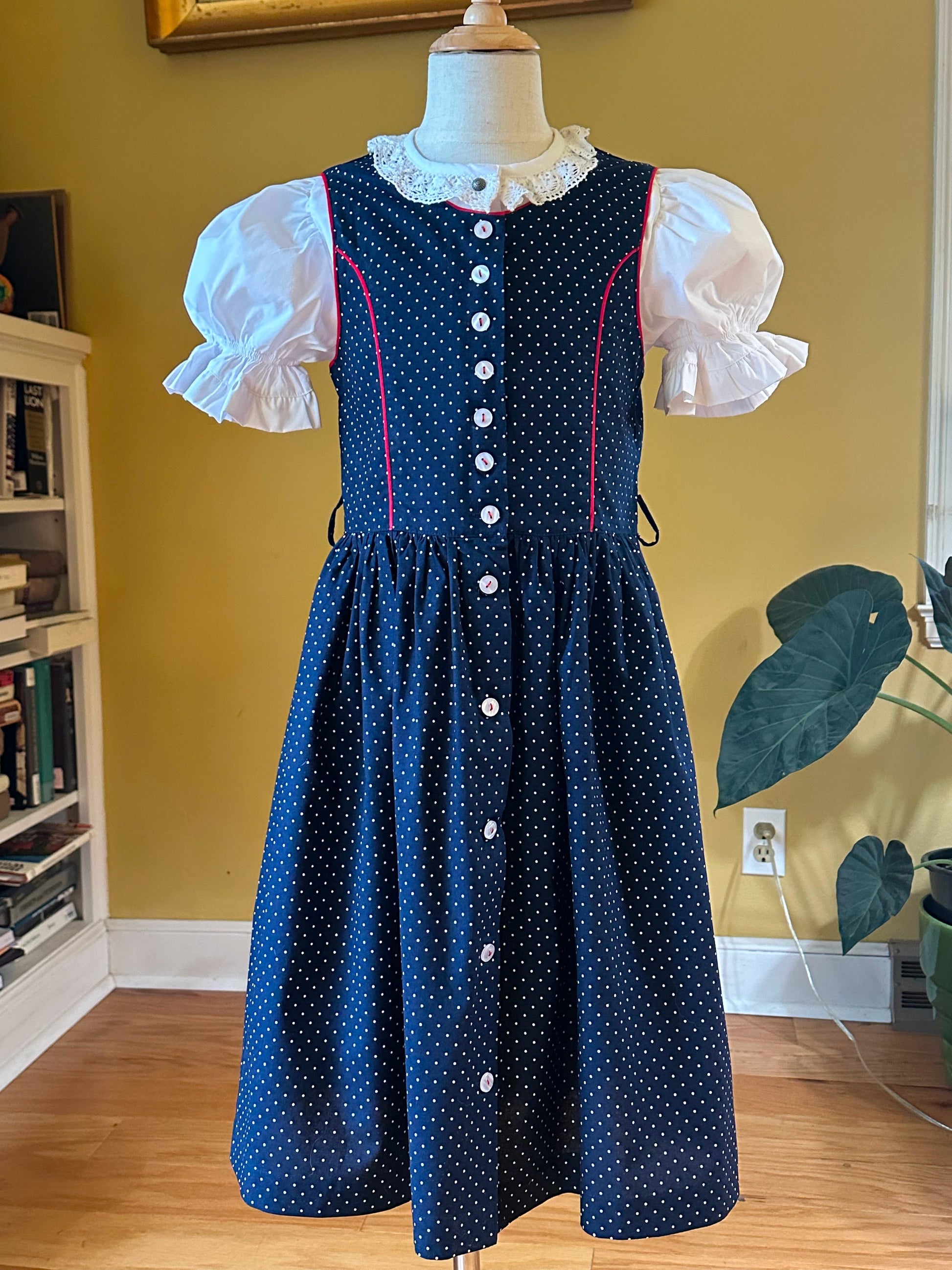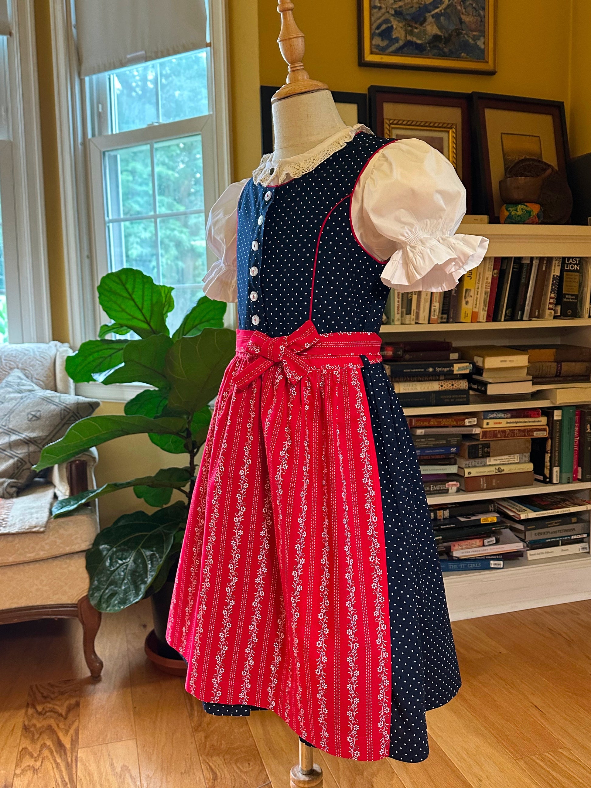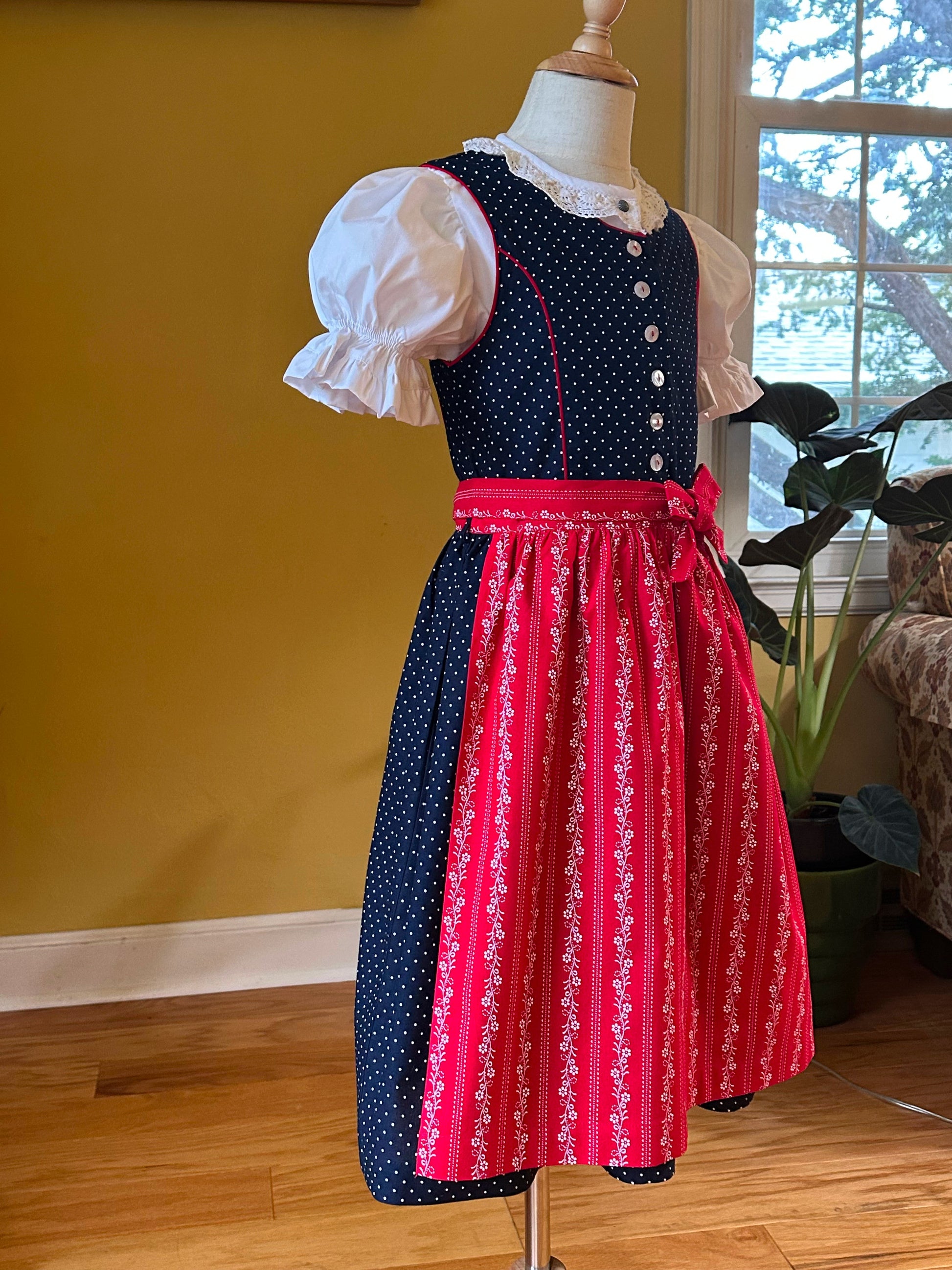 Breathable for summer and built to withstand some play. A traditional color pairing with red piping on the bodice and mother-of-pearl buttons all the way from bodice to hem. White lace trims the shirt collar, pleating trims the puffed sleeves, while shirt buttons are metal. Part of Isar Trachten's 2024 "Die Traditionellen" collection.