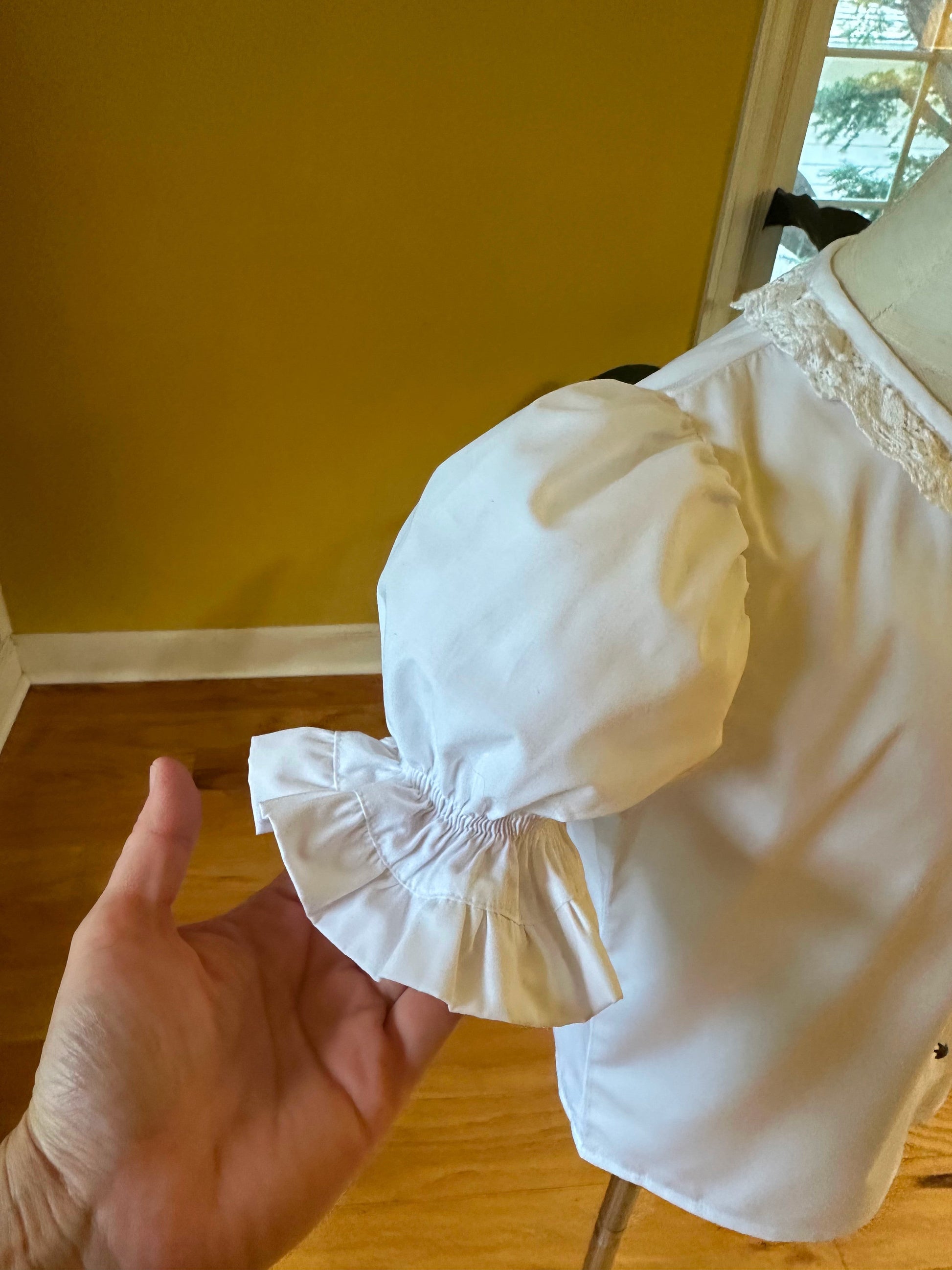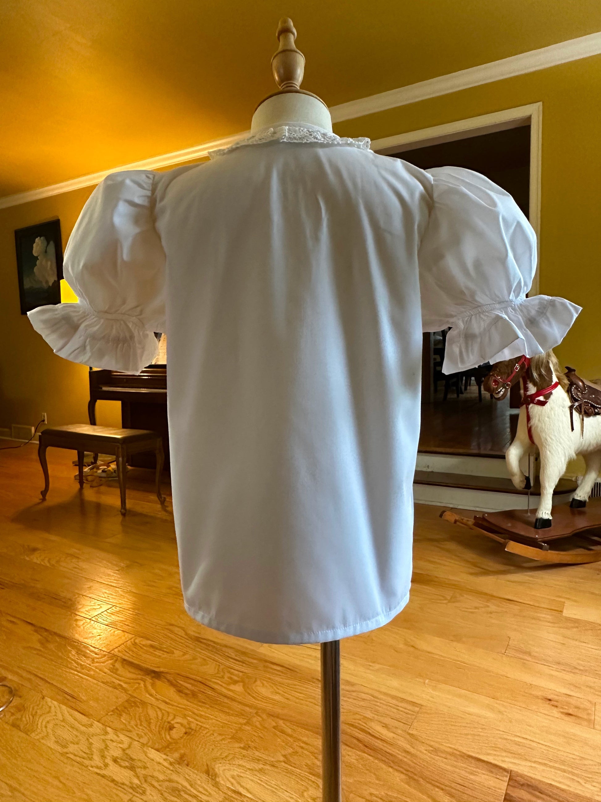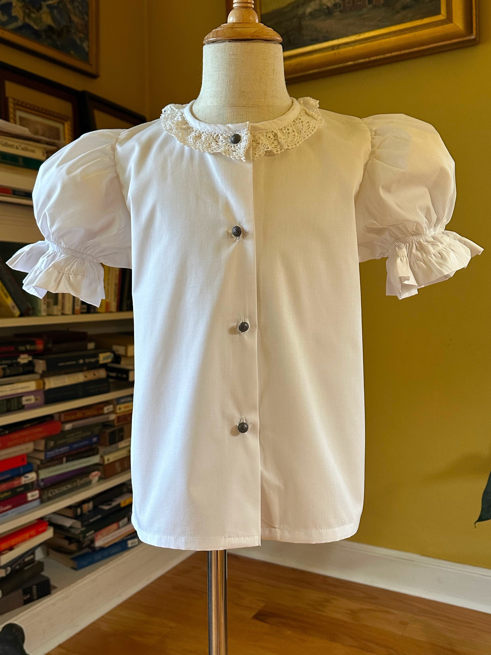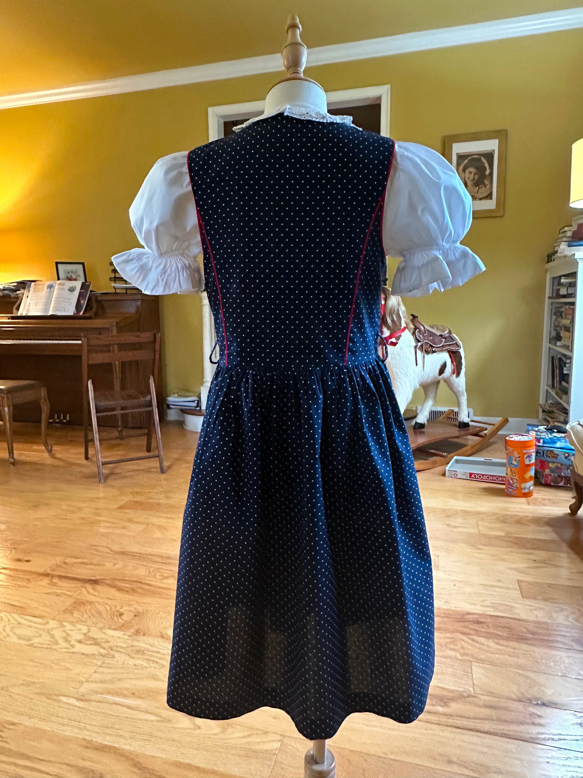 Breathable for summer and built to withstand some play. A traditional color pairing with red piping on the bodice and mother-of-pearl buttons all the way from bodice to hem. White lace trims the shirt collar, pleating trims the puffed sleeves, while shirt buttons are metal. Part of Isar Trachten's 2024 "Die Traditionellen" collection.