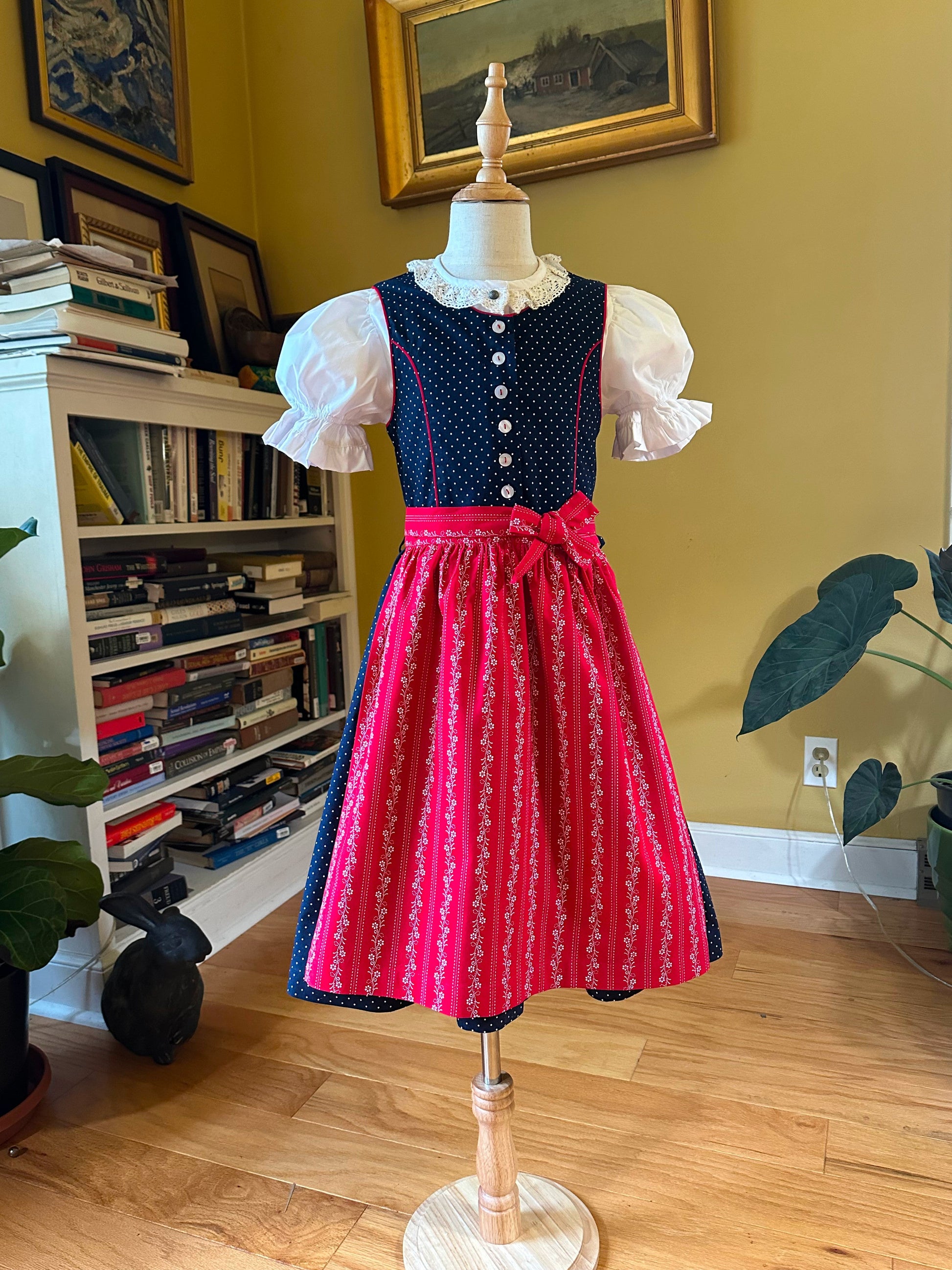 Made in Germany. This is a set: dirndl (navy blue), shirt (white) and apron (red) are included. 100% cotton.