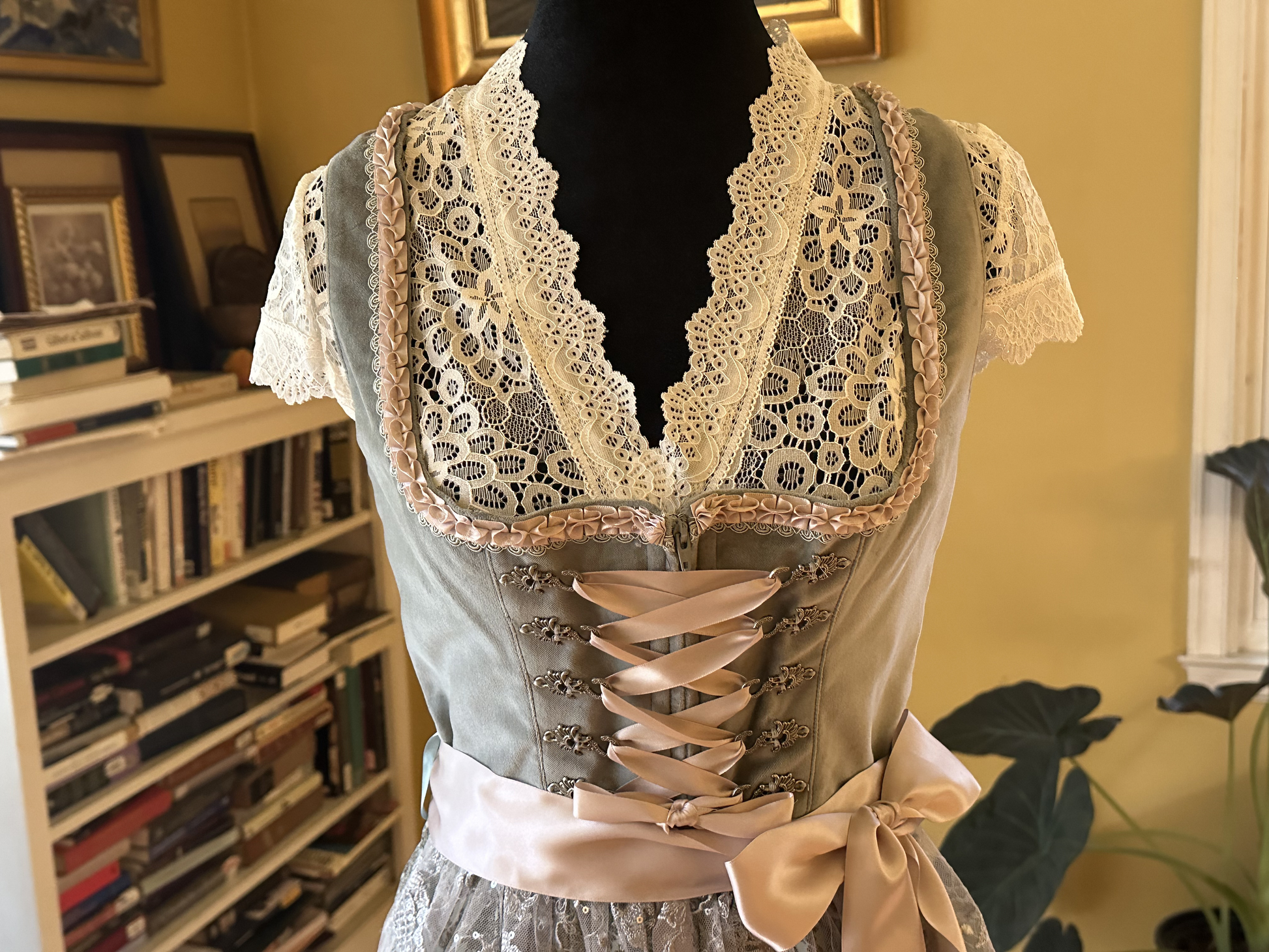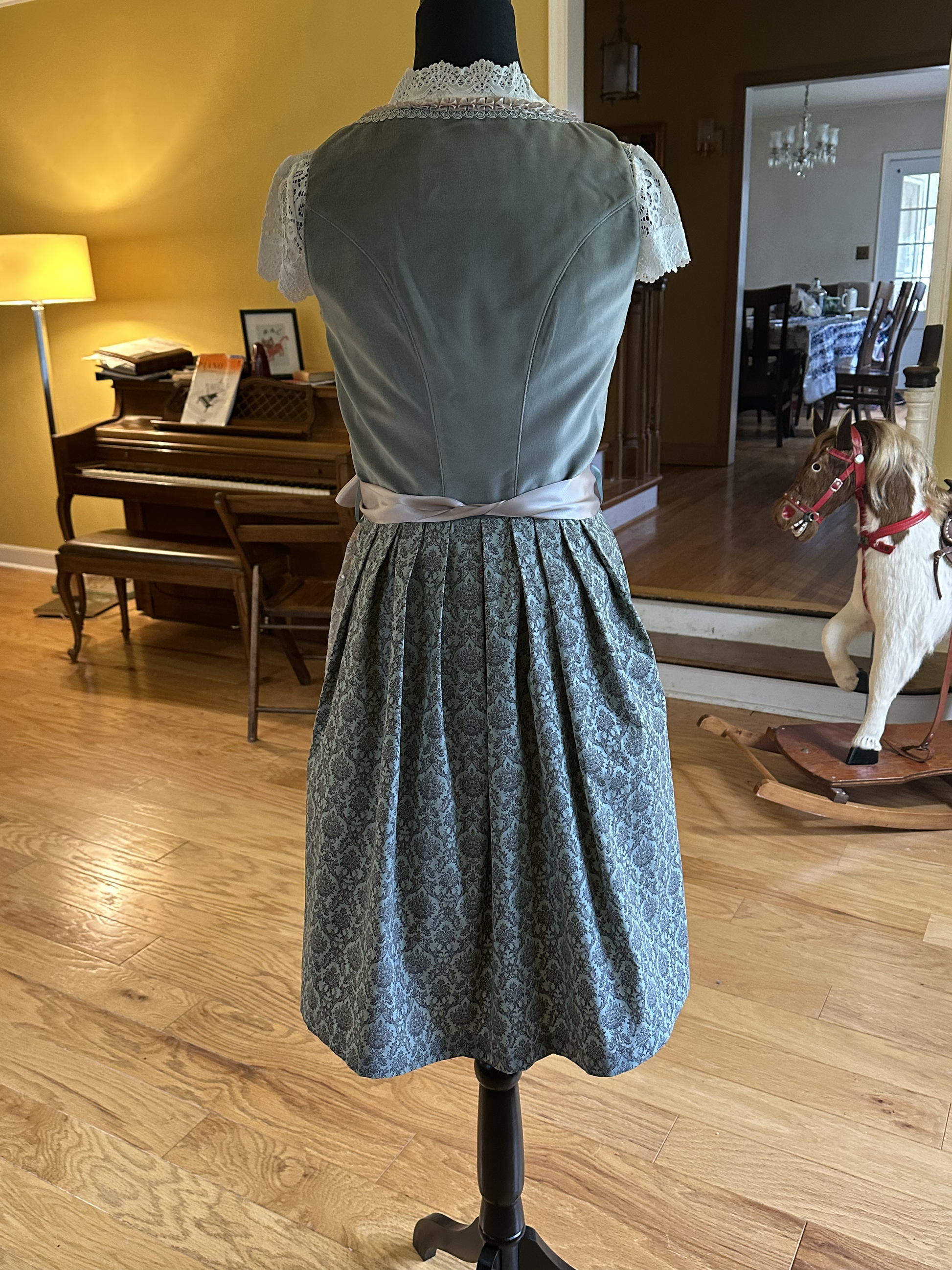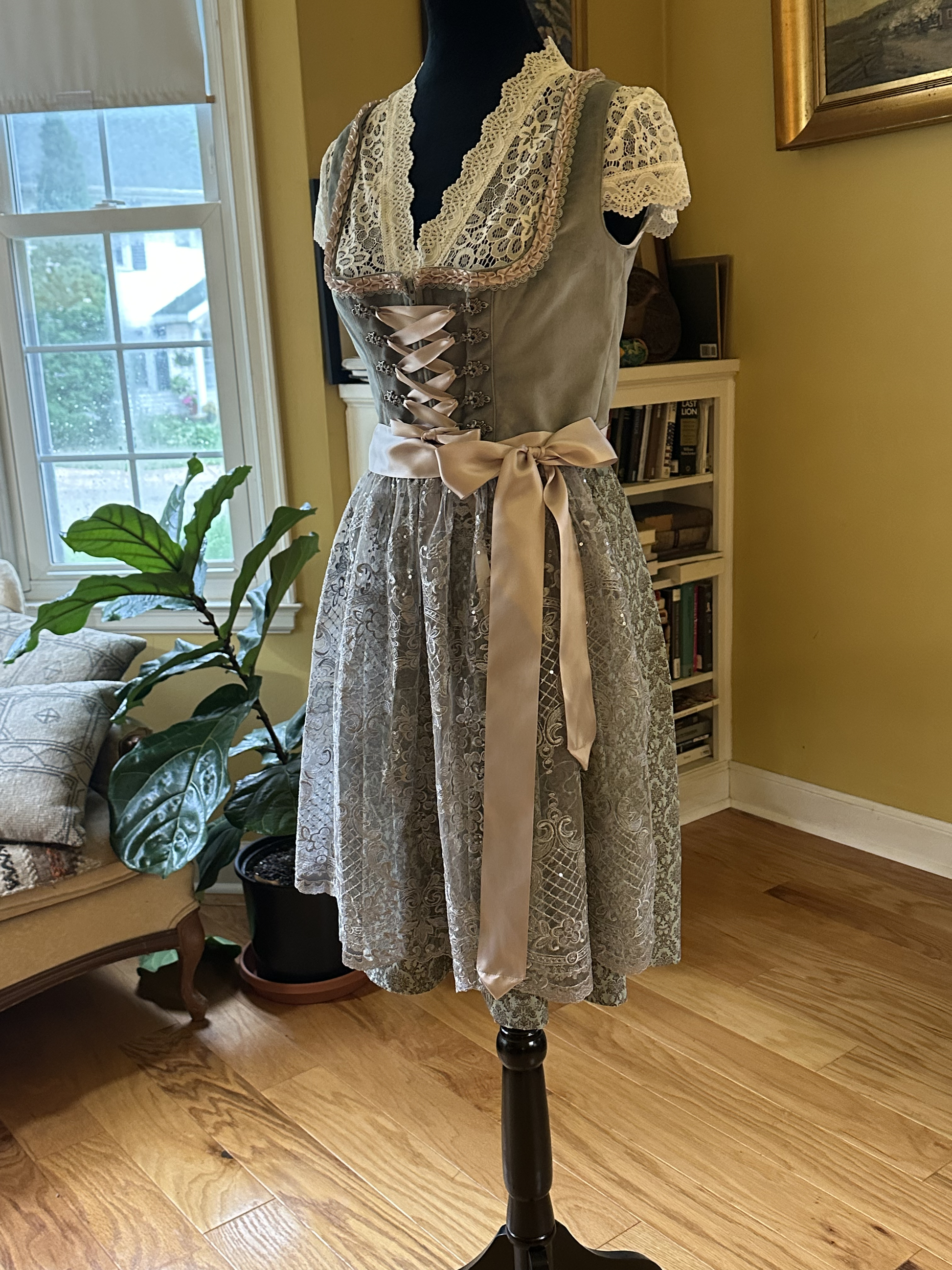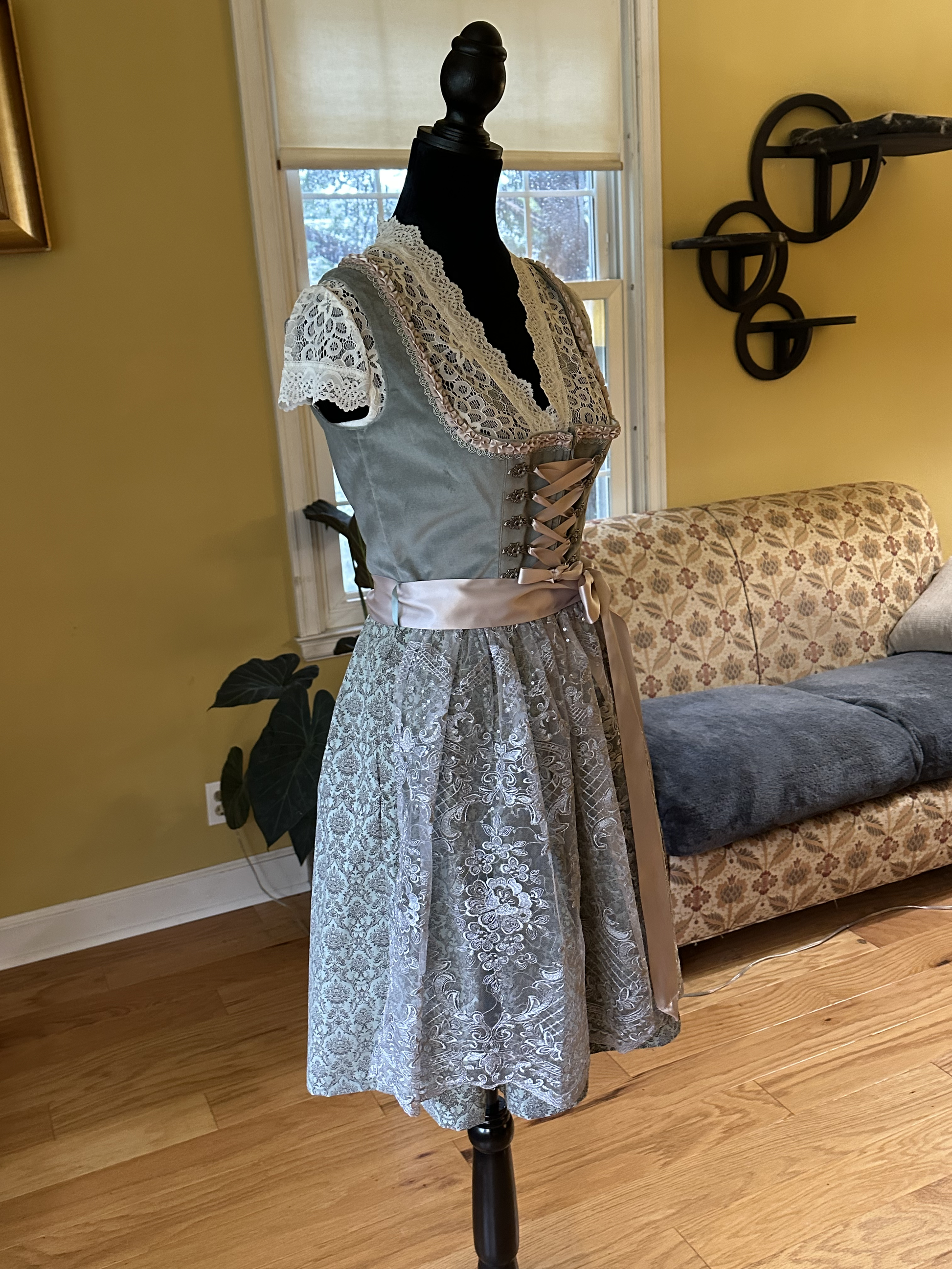 Stockerpoint Ladies' Mini Dirndl "Loredana". This dirndl has a velvet silver/gray bodice with nude pink ribbon and silver braid trim. The bodice closes with a zipper, over which a nude-pink ribbon corset detail weaves between silver-metal hooks. The length of the ribbon can be adjusted to your desire. This dirndl's skirt is a soft gray-teal with a fashionable damask print. The apron has a nude pink ribbon and lace fall worked with the occasional sequin sparkle. The lace is from man-made materials. Limited sizes available.